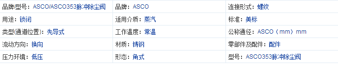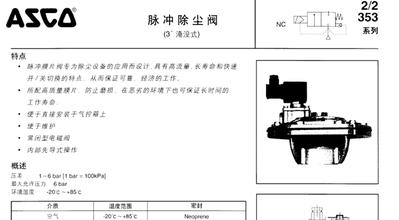 脈沖閥SCG353A050 SCG353A051 ASCO353脈沖除塵閥 產(chǎn)品介紹: 除塵閥為內(nèi)置先導(dǎo)式結(jié)構(gòu),閥體材料為鋁質(zhì),螺紋連接或旋壓接頭連接,接口大?。?/4″至3″。產(chǎn)品特點: 脈沖膜片閥專為除塵設(shè)備的應(yīng)用設(shè)計,具有高流量,長壽命和快速開/關(guān)的特點,從而保證可靠經(jīng)濟的工作;角形閥體,無彈簧結(jié)構(gòu),以及特殊的隔膜組件給了除塵設(shè)備應(yīng)用所需的獨特的操作特點;集成旋壓接頭設(shè)計,便于安裝,無須螺紋連接管;高品質(zhì)膜片,耐磨,長壽命(即使在相當(dāng)惡劣的條件下工作);電磁閥符合國際標(biāo)準(zhǔn)。脈沖除塵閥 SCG353A044 24VDC220VAC SCG353A047 24VDC220VAC SCG353A050 24VDC220VAC SCG353A051 24VDC220VAC SCG353.060 24VDC220VAC \